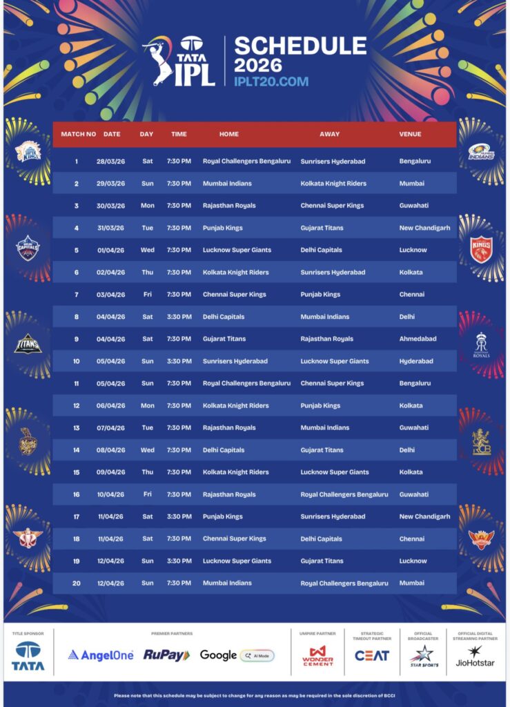 మార్చి 28న RCB vs SRH మ్యాచ్ తర్వాత మార్చి 29న ముంబై వాంఖేడే స్టేడియంలో మరో రోమాంచకర మ్యాచ్.. ముంబై ఇండియన్స్ vs కోల్కతా నైట్ రైడర్స్. మార్చి 30న గువాహటిలో చెన్నై సూపర్ కింగ్స్ vs రాజస్థాన్ రాయల్స్ జరుగుతుంది. మార్చి 31న పంజాబ్ కింగ్స్ vs గుజరాత్ టైటాన్స్ ముల్లాన్పూర్లో జరుగుతుంది. BCCI అసెంబ్లీ ఎన్నికల షెడ్యూల్ రాని కారణంగా ముందు 20 రోజుల మ్యాచ్లు మాత్రమే విడుదల చేసింది.. మిగతా షెడ్యూల్ తర్వాత వస్తుంది.