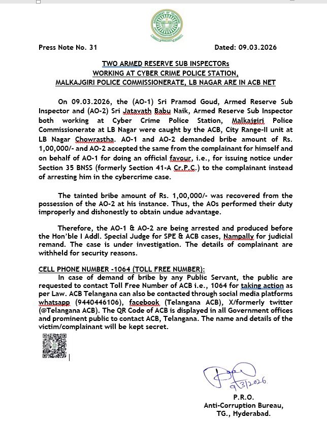 విశ్లేషణ: సైబర్ క్రైమ్ పోలీస్ స్టేషన్.. ఇది ప్రజలకు డిజిటల్ మోసాల నుండి రక్షణ కల్పించాల్సిన చోటు. అదే స్టేషన్ SI లు 41 నోటీసుల పేరుతో లక్ష రూపాయలు డిమాండ్ చేయడం విధి నిర్వహణకు మచ్చ. బాధితుడు భయపడకుండా ACBకి ఫిర్యాదు చేయడం వల్ల నిందితులు పట్టుబడ్డారు.. ఇది సమాజానికి ఒక సందేశం. లంచం డిమాండ్ చేసే పోలీసులకు భయపడకుండా ACB 1064కి ఫిర్యాదు చేయాలని APB News ప్రజలను కోరుతోంది.