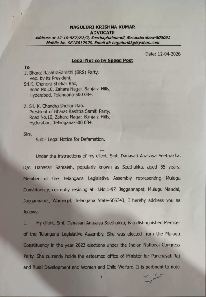 హైదరాబాద్, ఏపీబీ న్యూస్: రాష్ట్రంలో అధికార కాంగ్రెస్ మరియు ప్రతిపక్ష బీఆర్ఎస్ మధ్య యుద్ధం ముదురుతోంది. అంగన్వాడీలకు సరఫరా చేసే మొబైల్ ఫోన్ల కొనుగోలులో భారీ అవినీతి జరిగిందంటూ బీఆర్ఎస్ సోషల్ మీడియా వేదికగా చేస్తున్న ప్రచారాన్ని మంత్రి సీతక్క తీవ్రంగా ఖండించారు. ఈ మేరకు బీఆర్ఎస్ అధినేత కేసీఆర్కు ఆమె లీగల్ నోటీసులు పంపడం చర్చనీయాంశంగా మారింది.