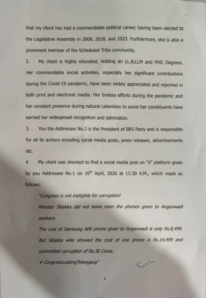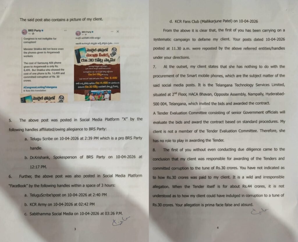 మంత్రి సీతక్క తరపు న్యాయవాదులు పంపిన ఈ నోటీసుల్లో పలు కీలక డిమాండ్లు చేశారు: